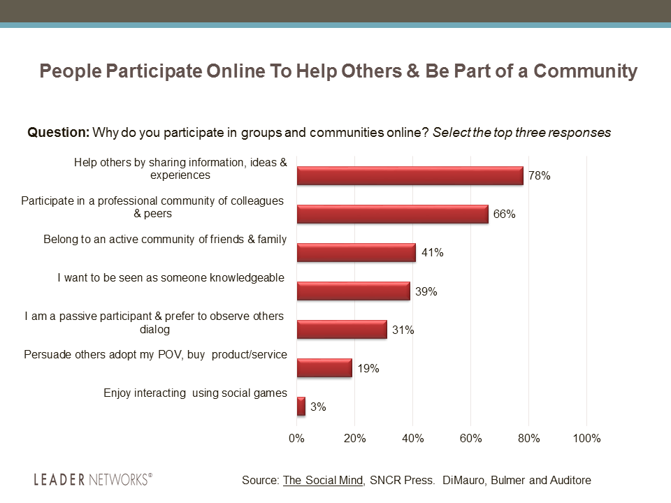 One of the most common questions people ask is why do people participate in online communities. Even after seeing many online communities succeed over time, this remains a tough question to fully understand. For some, the act of logging onto a computer network and having a conversation with someone you have never met seems utterly foreign, but these are often the same people who will happily chat up a stranger in the grocery line. For others, it is a totally natural act to collaborate electronically with others. Go figure.