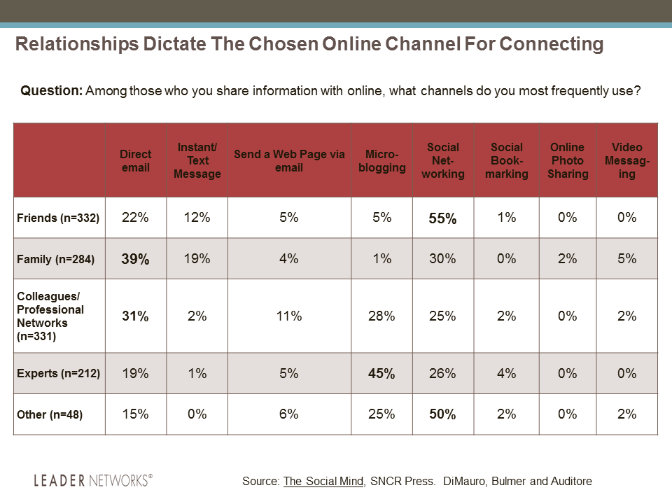 According to the research, people spend most of their time online with colleagues in professional networks (41%), followed by friends, family and experts. Only 13% report spending the most time online with their family. Seems the closer the relationship probability, the less time online is shared. In the survey, we had an “Other” category and it was interesting that the most common fill-ins pertained to business; most popular fill-ins included customers, prospects, and clients. Business use of social networking is definitely top-of mind for many users. We then poked around a bit to learn how, if at all people’s use of social media channels varied by relationship. There is a significant different in what channel people choose to reach others in their lives.
