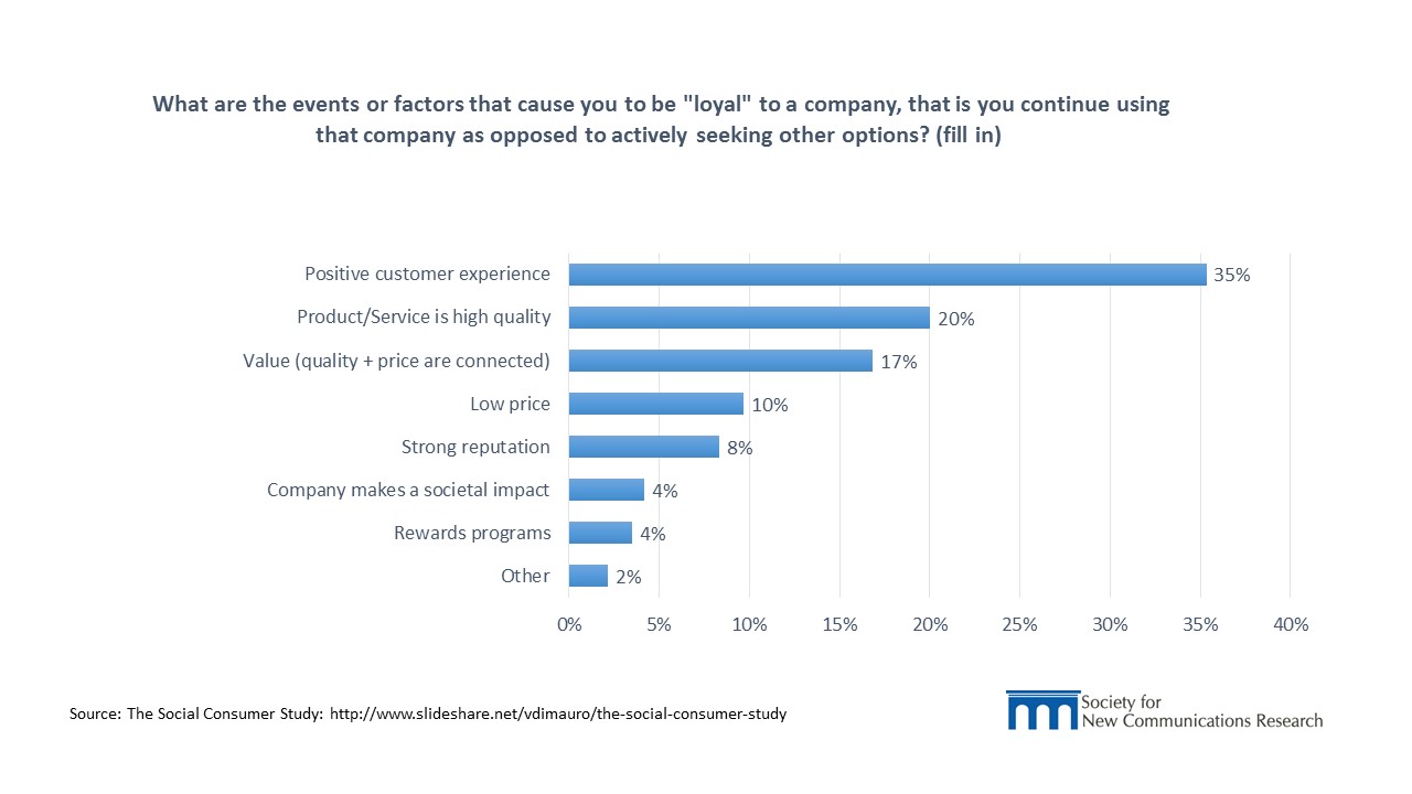 Once someone becomes a customer, positive customer experience is the leading indicator of whether the customer will become loyal to the company or brand– by a very wide margin. A positive customer experience is even more important than price in retaining the hearts and wallets of customers. This is especially important for companies to understand and support (as the chart above indicates) because how a customer is treated in the store, on the phone and online is more meaningful than the product offering or the overall reputation of the company. It is especially interesting to note the contrast between the impact of rewards programs and strong customer care experiences.